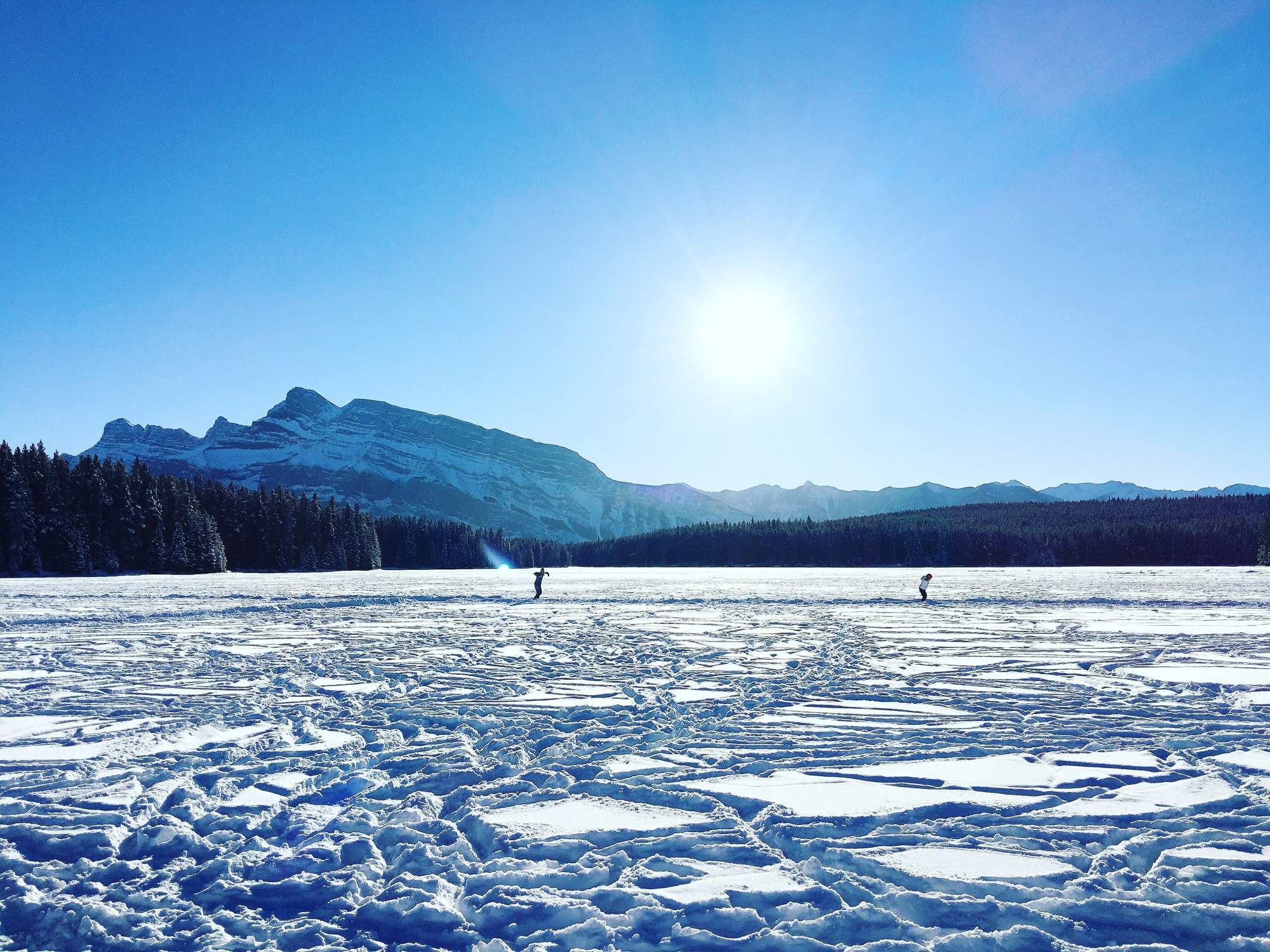 Es ist soooo kalt…daher erstmal zum Aufwärmen ins Gemäuer und ne heisse Schoki genießen. Die nächste activity geplant ging es anschließend mit dem Auto – zum Glück haben wir ne Tiefgarage im Hotel *bibber* – zum Lake Minnewanka vorbei am Two Jack Lake. Von den tiefblauen Wassern ist zu dieser Jahreszeit natürlich nicht wirklich viel zu sehen: stattdessen aber eine zenti- oder vielleicht auch meterdicke Eisschicht mit gepuderter Schneedecke. Zum ersten Mal wagen wir uns also zu Fuß auf einen gefrorenen See – die nächtlichen minus 20 Grad und die anderen „mutigen“ Seegänger nehmen uns die letzte Skepsis, ob das auch wirklich hält 😊 Ein gigantischer Blick eröffnete sich uns einige hundert Meter weg vom Ufer – das Panorama ist einfach traumhaft. Strahlend blauer Himmel, schneebedeckte Berge und Tannen und eine riesige Schnee- und Eisfläche, wo eigentlich der See sein sollte. Die Kanadier wissen das ebenfalls zu schätzen, denn es zeigte sich schnell, dass es hier eine übliche Freizeitbeschäftigung ist, mit den Schlittschuhen über das Eis zu schlittern oder mit den mitgebrachten Schneeschiebern ein Hockey-Feld freizuschippen und mit der ganzen Family dem Puck hinterherzujagen! Tolle Sache!