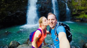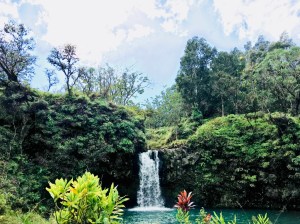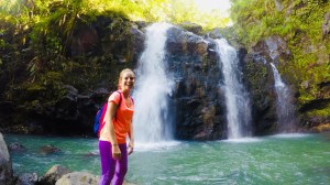 Bei den Upper Waikai Falls wurde es spannend…von der Brücke aus sahen die Wasserfälle wirklich spektakulär aus – aber wie sollten wir dort runterkommen? Es war definitiv möglich, denn andere vor uns hatten es geschafft – irgendwie…Ein steiler Zustieg von der Straße aus, einmal unter der Brücke durch, am Bambus vorbei, hinunter zu den nassen Steinen („slippery when wet“ hat uns den ganzen Tag begleitet…) und dann irgendwie durchs Wasser waten…der Aufwand und Nervenkitzel war es wert, so nah an den tosenden Falls zu stehen. Der Weg nach oben war dann gar nicht mehr so schlimm 😉 Die Pua’a Ka’a Falls waren dagegen mehr als easy zugänglich! Hier dann sogar inklusive einer Runde schwimmen (zumindest einer von uns…).