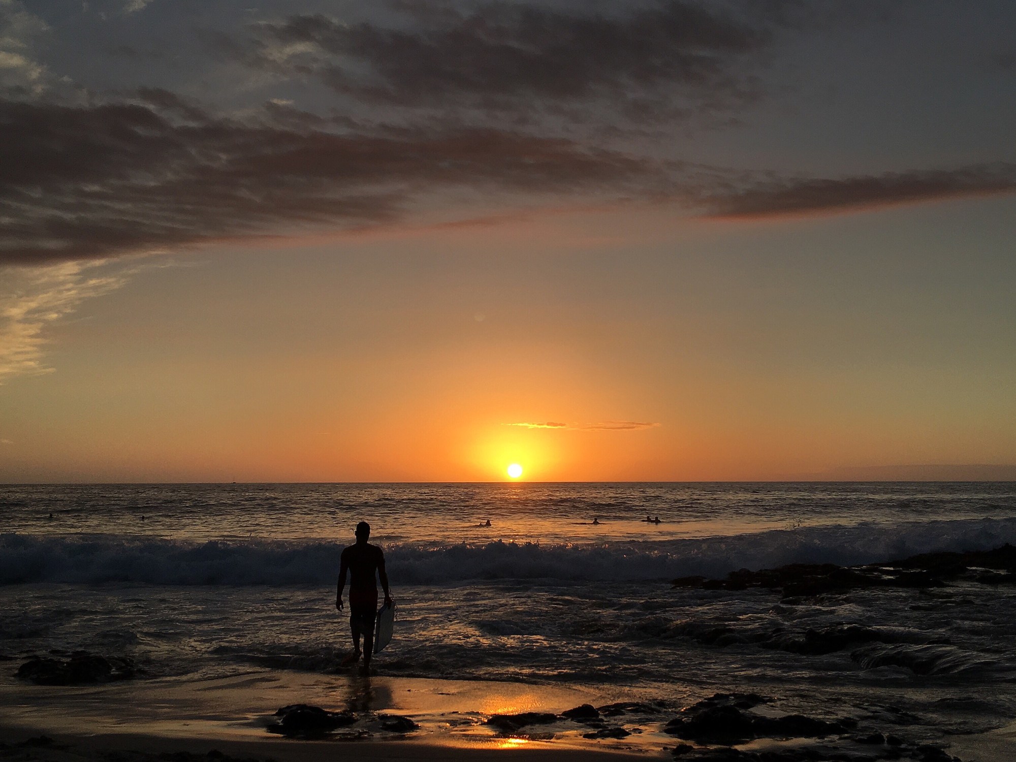 Der Weg die Westküste hoch war – wie kann es auch anders sein – immer wieder von Lavafeldern durchzogen, die sich als braune Schneise in die sonst hier so grüne Landschaft einfügen. Kailua-Kona als heutiges Endziel hatten wir am Nachmittag erreicht, in unserem Bed & Breakfast wurden wir herzlich willkommen geheißen und damit fehlte zu unserem heutigen Glück nur noch der Sonnenuntergang am Beach. Ok – haben wir dann direkt am kleinen aber feinen Magic Sands Beach in die Tat umgesetzt, den Wellenreitern beim Wellen reiten zugeschaut und jede Sekunde bis zum Sonnenuntergang genossen.