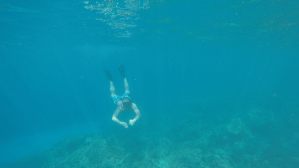 Unser zweiter Schnorchelstopp sollte am Cook Monument sein (ja, der James Cook, der Hawaii mal entdeckt hat, es sich aber leider mit den Hawaiianern verscherzte und das an dieser Stelle angeblich mit dem Leben bezahlte…). Der Spot wurde uns vielmals empfohlen – aber keiner hat uns genau gesagt, wie wir dorthin kommen (und hätten wir das mal gewusst…). Wie wir feststellten, konnten wir nicht bequem mit dem Jeep vorfahren *haha* sondern mussten über einen Trail durch den Kealakekua Bay State Historical Park dorthin wandern. Etwas blauäugig machten wir uns in Flipflops auf in Richtung Küste (das Schild zu Beginn des Trails „Think twice: wear good shoes, bring lots of water…“ und so weiter ignorierten wir mal J Stetig bergab (wir mussten vom Startpunkt aus 400 Höhenmeter überwinden) ging es die angeblich nur 3 km lange Strecke schön zur Mittagshitze bei bestimmt 30 Grad über einen unbefestigten Trail, der immer schmaler wurde, teils durch meterhohes Gras, dann quer über ein Lavafeld bis endlich hin zur Küste. Auch hier hatten wir mal kurz das Gefühl, das wir unser Ziel nie erreichen (Erinnerungen an die Wanderung zum Lava Stream wurden wach J der Ozean kam einfach nicht näher). Flipflops waren wirklich nicht die beste Wahl und die paar Menschen, die uns entgegengekommen sind, haben dies sicherlich auch gedacht *ups* Nach dann doch etwas über einer Stunde waren wir endlich unten angekommen. Schade, dass just in diesem Moment ein Ausflugsboot mit zahlreichen Schnorcheltouristen ebenfalls in der Bucht Halt machte (ja – man kann hier mit dem Boot hinkommen und das wäre sicherlich einfacher gewesen J ). Mit weiteren Mutigen, die den Weg über den Trail oder per Kajak zum Monument gefunden hatten, ging es dann ab ins kristallklare Wasser (ok, zumindest für einen von uns). Hat sich dann doch gelohnt. Uns graute es nur etwas vor dem Rückweg…der Weg nach oben war wie so oft im Leben hart und steinig J aber: we made it! Kann auf jeden Fall keiner behaupten, dass wir an diesem Strandtag nur faul herumgelegen haben, denn die Beine waren jetzt ganz schön schwer und eine ordentliche Cardio-Einheit haben wir mit dem Anstieg ebenfalls absolviert. Unser chicken im Big Island Grill hatten wir uns an diesem Abend auf jeden Fall mehr als verdient!