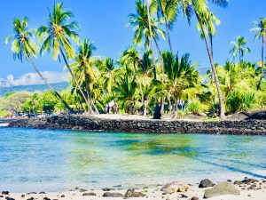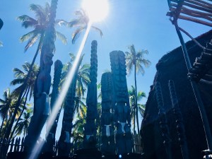 Mit Flossen und Taucherbrille bewaffnet ging es daher völlig entspannt zur Honaunau Bay fürs Schnorcheln am „Two Step“. Nette Location mit Einstieg über Lavafelsen, vielen bunten Fischen im angenehm warmen Wasser – und vielen anderen Menschen. Nach zwei Schnorchelgängen und entspannendem Sonnenbaden, drehten wir daher diesem Hotspot für Schnorchler den Rücken zu und stattdessen noch eine Runde durch den Pu’uhonua O Honaunau National Historical Park, ein historischer Ort mit nett aufbereiteten Überbleibseln hawaiianischer Kultur am Place of Refuge – und Green Hawaiian Sea Turtles, die es an diesem heißen Tag auch richtigmachten und am Strand chillten oder im Wasser planschten.