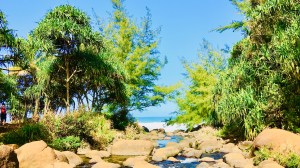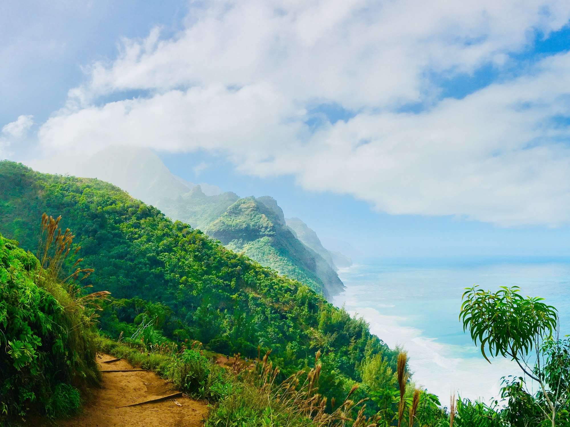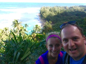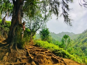 Unser eigentliches Ziel war heute der Hanakapi`ai Beach, gelegen an der viel empfohlenen Nā Pali Coast und nur erreichbar über den Kalalau Trail. Eigentlich „nur“ ein 3,2 km langer Trail, der am Küstengebirge entlangführt – aber der hatte es in sich. Wir waren ja von unseren Hikes zum Lava Stream oder auch Cook Monument auf Big Island schon etwas vorbereitet auf die hawaiianischen Trails. Zum Glück 🙂 Heute ging es mit ordentlichem Schuhwerk und viel Wasser ausgestattet auf den Trail. Wie ein schmaler Streifen schlängelte sich der Weg an den Felsen entlang. Fast unnatürlich, da ein solch „viel belaufener“ Trail (wir waren hier wahrlich nicht die Einzigen…) eigentlich gar nicht in das unwegsame Gelände passt. Auf der einen Seite der türkisblaue Ozean, dessen tosende Wellen ohrenbetäubend gegen die Felsen krachten, auf der anderen Seite abwechselnd Dschungel (zwischenzeitlich sogar gut riechend nach Lemongrass, als hätte jemand ne Duftkerze aufgestellt…), Urwald und Nadelbäume. Über Stock und Stein wäre hier noch ein wenig untertrieben in der Beschreibung…auf und nieder ging es, über sandige Wege und dann wieder mitten im Matsch, da selbst die kleinsten Wasserläufe, die die Berge herunterkamen, den Weg aufweichten. Bei regnerischem Wetter ist dieser Trail sicherlich kein Spaß und auch recht gefährlich. Diese Gedanken mussten wir uns aber nicht machen, sodass wir bei Sonnenschein nach jeder Biegung, wenn sich ein neues, tolles Panorama die Küste entlang ergab, stehen bleiben und genießen konnten. Traffic war nicht nur auf dem Weg selbst, auch in der Luft war an der Küste Einiges los heute. Helikopter reihte sich an Helikopter, um die spektakulären Aussichten auf Kauai mit seinen Canyons und unzugänglichen Küstengebirgen zu genießen. Meist aber waren die Wellen unter uns lauter als die Rotorblätter 😉
