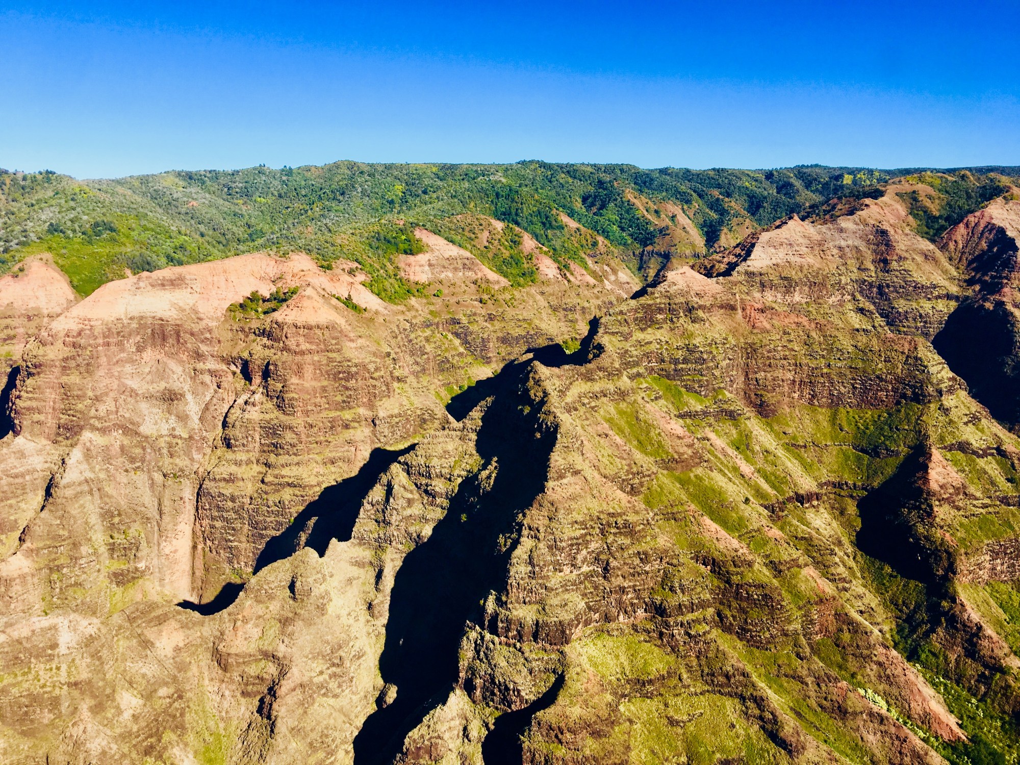 Bei bestem Wetter und günstigen Flugbedingungen stiegen wir auf über die Insel. Es ging westwärts am Kawaikini vorbei in Richtung Waimea Canyon. Die Aussicht von hier oben war gigantisch! Die steilen Erhebungen in den vielen Privat- (es gibt hier wohl doch sehr viele Großgrundbesitzer, denen ein guter Anteil der Insel oder ein paar Wasserfälle und Canyons gehören) oder State Parks durchzogen die ganze Insel. Riesige Waldflächen breiteten sich unter uns aus, in denen sicherlich aufgrund der Unzugänglichkeit noch kein Mensch war. Dann erhoben sich die roten, blanken Felswände des Waimea Canyons vor uns, die von der Morgensonne schön in Szene gesetzt wurden! Einen solchen Canyon hätten wir wahrlich nicht auf der Garten-Insel vermutet.