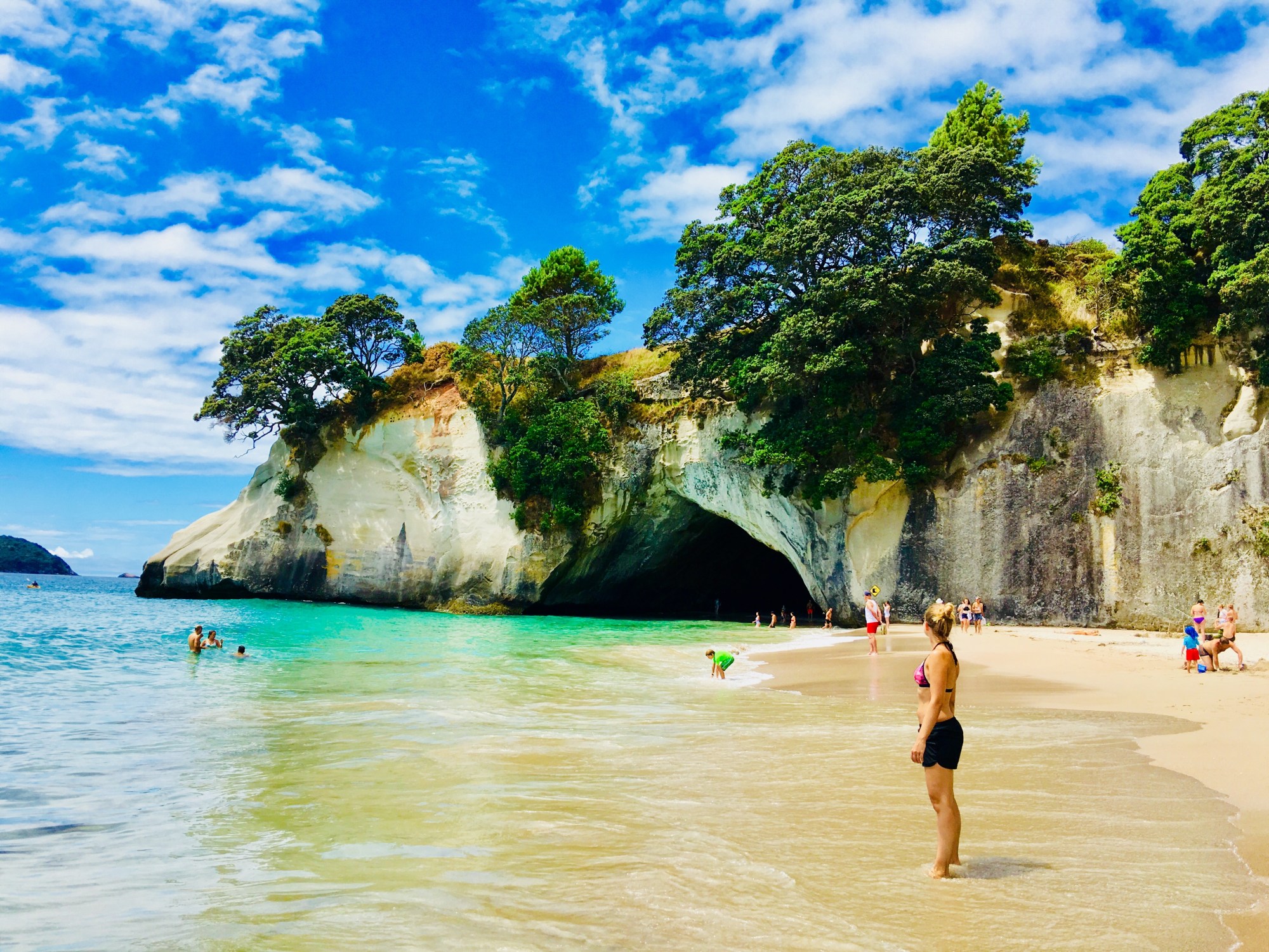 Es ging Serpentinen hoch und runter, als wir zunächst den Coromandel Forest Park durchquerten. Die im Tal zuvor noch ausgedehnten, ordentlichen Weideflächen – wer was auf sich hält, hält sich hier Schafe oder Rindvieh (oder beides) – wurden abgelöst von Dschungel und bunten Mischwäldern. Es zirpte an jeder Ecke. An tollen lookouts vorbei näherten wir uns dem Strandörtchen Hahei. Zu Fuß sollte uns nun ein kurzer Trail zur berühmten Cathedral Cave führen. Vom Startpunkt aus waren dies wirklich nur ein paar Kilometer, die wir mittlerweile bei Sonnenschein ☀ zurücklegen konnten. Und neuseeländische Trails sind sogar geteert, da waren wir aus Hawaii ganz anderes gewohnt 😉. Der Weg zur Bucht schlängelte sich hier ebenfalls auf und nieder an der Küste entlang. Am Beach angekommen, zeigt sich die cove in voller Pracht (und immerhin ca. 40 m hoch). Das Wasser hatte hier über die Jahrhunderte den Felsen so ausgewaschen, dass eine kathedralenförmige Höhle entstanden ist, die sich durchqueren und damit den nebenan gelegenen Strandabschnitt erreichen lässt! Grund genug, die Flipflops auszuziehen und die mitgebrachten Bagels vor dieser beeindruckenden Kulisse zu futtern!