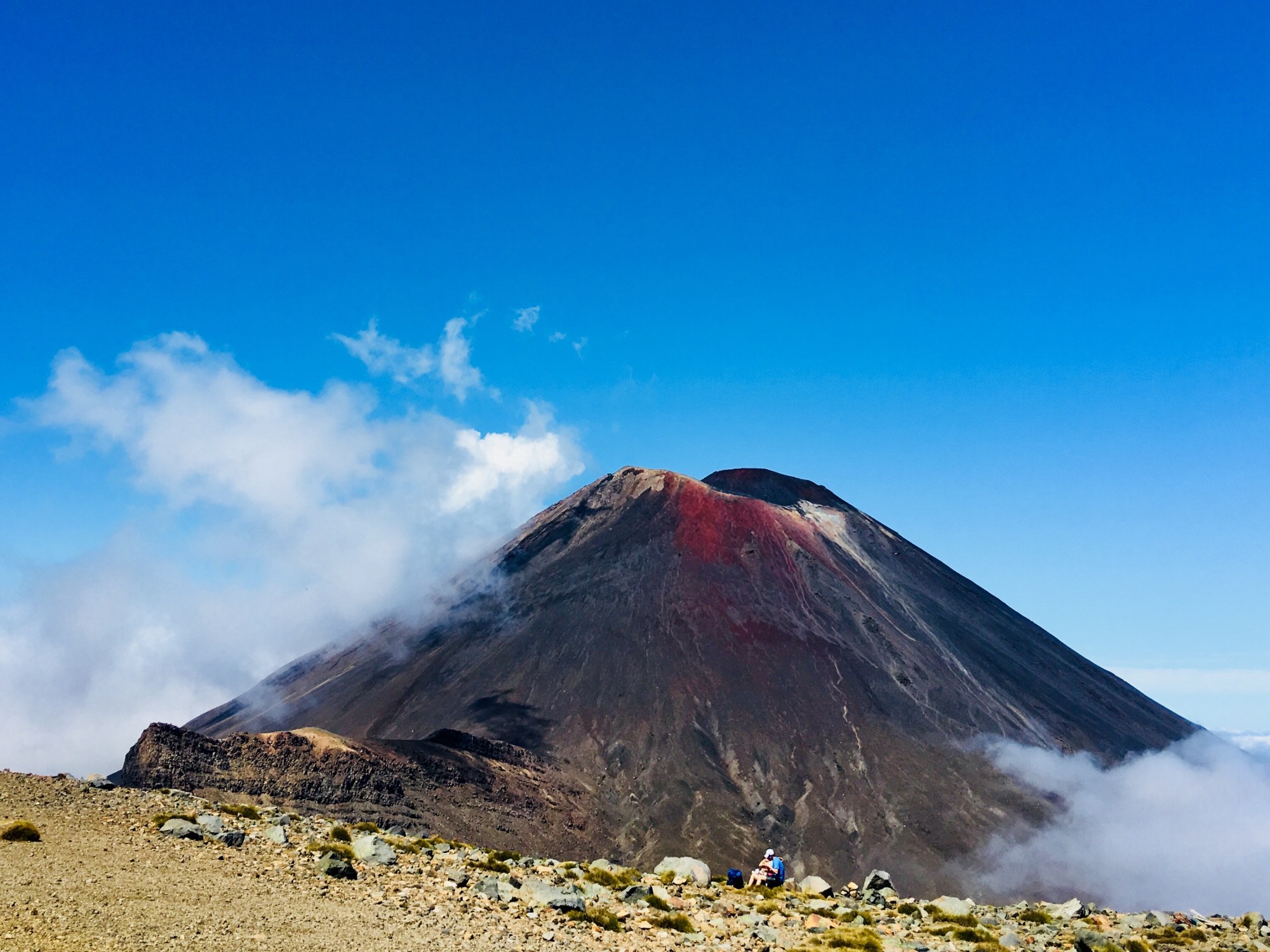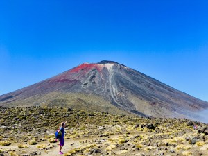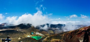 Oben angekommen, öffnete sich nicht nur der Hochnebel, vor uns lag nun ein Krater am Fuße des Mount Ngauruhoe (wer „Herr der Ringe“ kennt: das wäre dann der Schicksalsberg) — wirklich angenehm, mal wieder auf ebenem Weg durch den Krater durchzugehen! Die Sonne knallte von oben und wir schmierten fleißig alles mit Sonnencreme ein, was nicht mit Klamotten oder Rucksack verdeckt war.