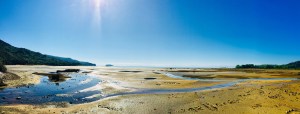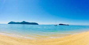 Und ein Glück sind wir Frühaufsteher, sodass wir pünktlich um kurz vor sieben in der Ferne über den Bergen die Sonne aufblitzen sahen. Keine Wolke in Sicht – das versprach, ein heißer Tag zu werden. Sollte uns nur Recht sein, denn heute war Wandern im Abel Tasman National Park angesagt. Ein großer Nationalpark an der nördlichen Küste der Südinsel, auf dessen berühmten Coast Track sich gut und gerne 5 Tage wandern lässt.