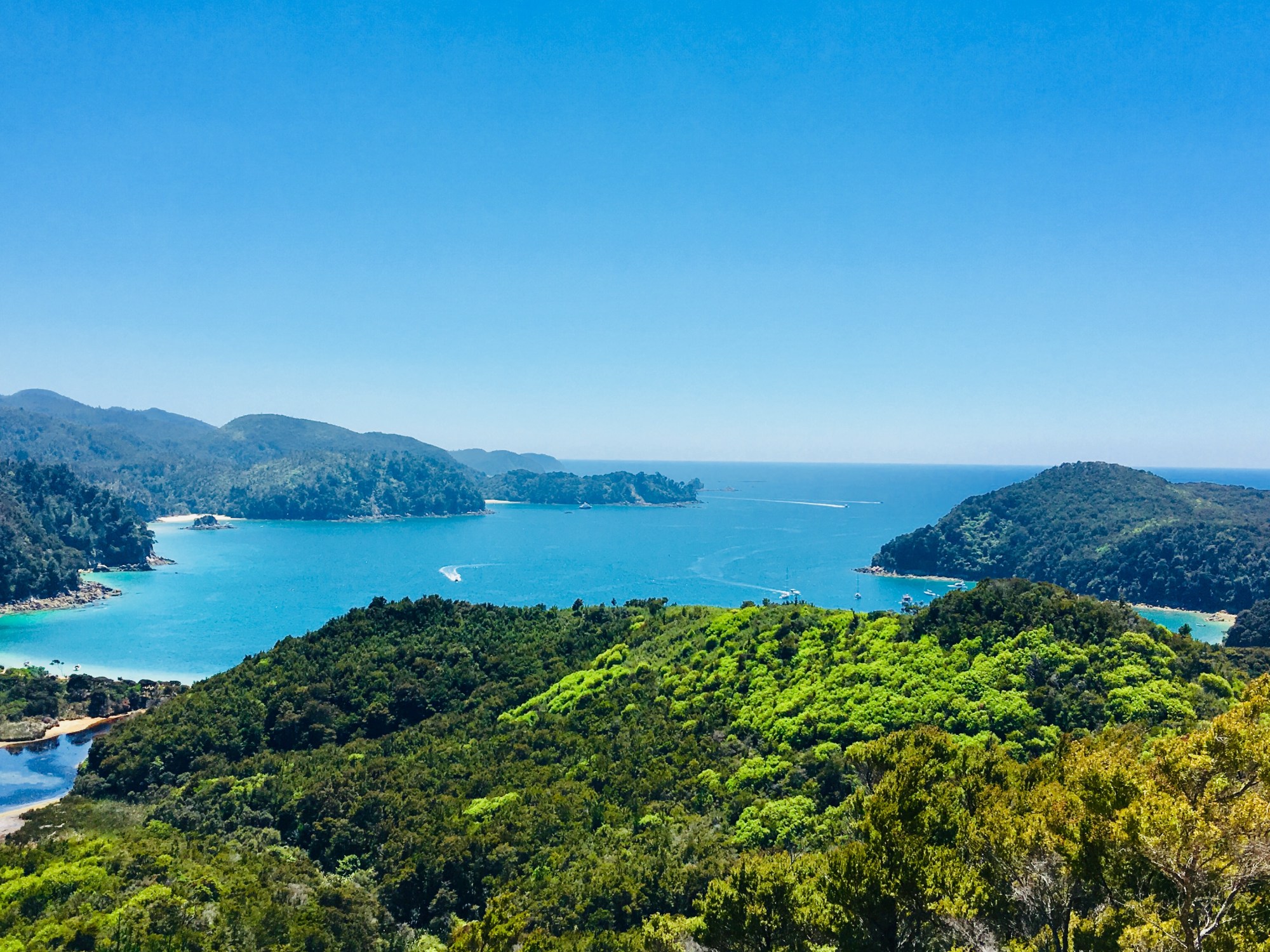 Und ein Glück sind wir Frühaufsteher, sodass wir pünktlich um kurz vor sieben in der Ferne über den Bergen die Sonne aufblitzen sahen. Keine Wolke in Sicht – das versprach, ein heißer Tag zu werden. Sollte uns nur Recht sein, denn heute war Wandern im Abel Tasman National Park angesagt. Ein großer Nationalpark an der nördlichen Küste der Südinsel, auf dessen berühmten Coast Track sich gut und gerne 5 Tage wandern lässt.