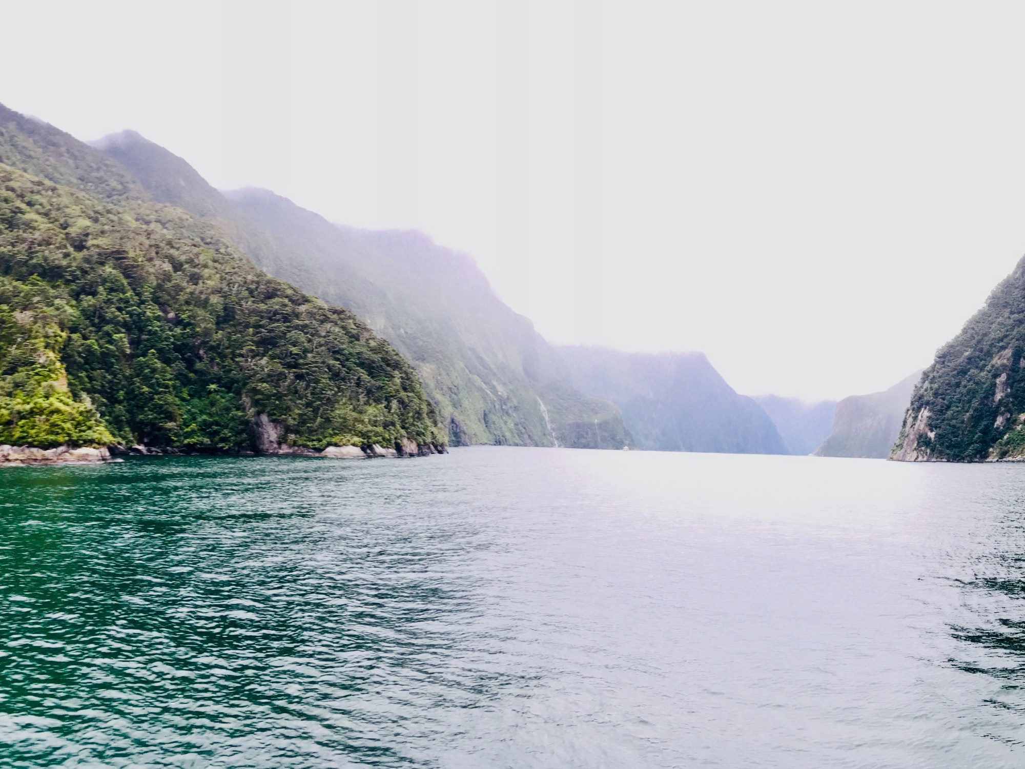 Wir hatten uns bewusst in Te Anau platziert, um die ausstehenden 120 km zum Fjord morgens gut fahren zu können – dennoch zeigte das Navi uns für diese vermeintlich kurze Strecke eine Fahrtzeit von 2,5 Stunden an! Puh – das war in unserer Planung so nicht berücksichtigt, denn um 10.30 Uhr sollte das Schiff ablegen 🙈 Wir sind ja mittlerweile gut vertraut mit neuseeländischen Straßen (oft zu lesen: „NZ roads are different – allow extra time“…), aber man weiß doch nie ganz genau, was einen erwartet…Wir legten also heute einen Zahn zu und brausten durch Fjordland (nur eine Schafherde mitten auf der Straße konnte uns kurz ausbremsen). Ließen den Lake Te Anau zurück, durchquerten das durch einen früheren Gletscher geformte Eglington Valley und sahen die Berge am Horizont höher werden. Weideland wurde mehr und mehr durch hohe Felswände begrenzt und das Tal wurde enger.