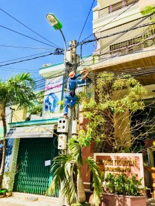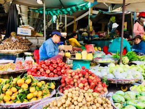 Und ein paar Querstraßen weiter hatten wir auch wieder den vietnamesischen „Charme“ gefunden. Bunte und schmale Townhäuser, viele Blumen überall, Motorrollergehupe und Knattern und Gestank, Ruhe in kleinen Gassen, wirre Kabelnetze an den Leitungsmasten, Marktstände mit Obst und Gemüse, totem Fleisch und lebenden Hühnern (kein schöner Anblick, wie das Chicken eventuell aussieht, bevor es in unserem Curry landet…).