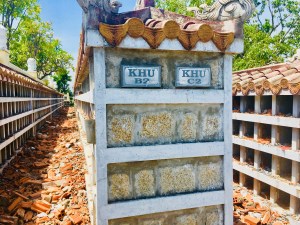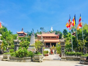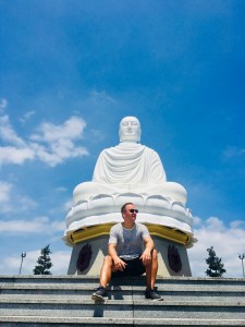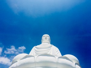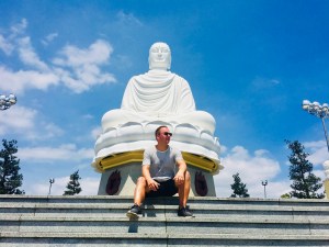 Schließlich erreichten wir die Long-Son-Pagode, ein buddhistischer Tempel und die vermeintliche Hauptsehenswürdigkeit der Stadt, somit klares Tour-Ziel 😉 Mit Shorts und Top allerdings nicht gerade geeignet für eine Innenbesichtigung – auch ok, wir schauen die Kirchen sowieso lieber von außen an. Daher ein paar Treppenstufen weiter nach oben zur nicht weniger sehenswerten Buddha-Statue, die über den Dächern Nha Trangs thronte, auf jeden Fall ein beliebtes Fotomotiv! Noch ein kurzer Gang zu den Grabstätten hinter der Statue, wo wir mit großer Verwunderung feststellten, dass ein Großteil der Urnengräber offensichtlich mutwillig zerstört und geschändet waren. Konnte uns aber keiner erklären, was hier geschehen war und der alte Mann, der es sicherlich wusste, sprach (wenn überhaupt) kein Englisch. Ein befremdlicher Anblick auf jeden Fall.