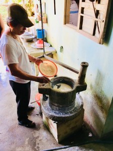 * wie man Reis mittels einer Sandsteinmühle auspressen kann, um den „Teig“ für die Herstellung von rice paper (banh trang) zu erhalten