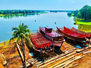 Einmal die Brücke überquert, war das Lebensgefühl gleich ein anderes – keine überfüllten Straßen mehr, kein (na gut – kaum) Motorroller-Gehupe, weniger dichte Besiedlung, die ersten Reisfelder vor uns und kleine Fischerboote (ohne Touristen) auf dem Kanal. Ein hektisches Stadtleben fand hier nicht mehr statt, hier stand der Fischfang, die Feldarbeit und viele weitere handwerklichen Tätigkeiten im Vordergrund, wie wir noch erfahren sollten J Mit Ben, der tatsächlich aus der ländlichen Gegend stammte, hatten wir einen authentischen Guide an unserer Seite, sodass wir bei vielen Stopps wirklich interessante Eindrücke in das Leben der Menschen hier gewinnen konnten.