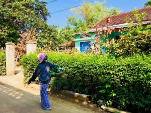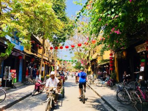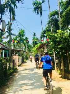 Wir waren wieder einmal früh dran – spontan hatten wir uns am Vortag erneut für eine Bike-Tour entschieden und so saßen wir um 7 Uhr im Shuttle nach Hoi An. Die Sonne hatte ebenfalls ihren Weg gefunden und kämpfte sich durch den letzten Frühnebel. Das versprach, ein warmer Tag zu werden. Bei Grasshopper Adventures stießen wir zum Rest unserer heutigen internationalen Cycle-Truppe und mit feinen Mountainbikes machten sich Kalifornier, Kanadier und Deutsche mitsamt vietnamesischem Guide auf, um die Countryside rund um Hoi An näher in Augenschein zu nehmen. Während die ersten Touris durch die engen Gassen des Städtchens flanierten, durchquerten wir das Zentrum nur kurz, fuhren über den Thu Bon River und erreichten Cam Kim Island, eine der vielen Inseln, die sich von Hoi An aus leicht erreichen lassen.
