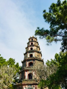 Ab auf die Straße, genauso frech wie Autofahrer und Motorroller durch den Verkehr und an Ampeln vorbeigeschlängelt, Brücke überquert, kritische Kreuzungen gemeistert und im Nu den ersten Stopp erreicht: die Thien Mu Pagoda, ein buddhistisches Kloster direkt am Fluss stadtauswärts gelegen. Bereits ab 1601 erbaut, scheint der Pagodenturm mit angrenzenden Tempel- und Klostergebäuden heute noch eine große Anziehungskraft auf Gläubige (und nicht minder wenige Touristen) auszuüben, denn es war nicht gerade wenig los. Alle Besucher trotzten der Vormittagshitze und arbeiteten sich die Stufen nach oben auf dem Weg in den schattigen Tempel, um den Mönchen beim Beten zuzuschauen (oder mitzubeten), oder in den schattigen Bonsaigarten. Wir drehten eine kurze Runde und entschieden dann, dass auf dem Fahrrad zumindest der Fahrtwind für etwas Abkühlung sorgt und wir somit schnell weitermussten 🙂