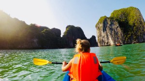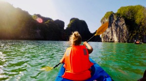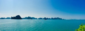 Wir ankerten inmitten der Hundertschaften an Booten, fuhren mit dem Beiboot ein paar Meter zur Kanustation und paddelten, begleitet von Booten voller singender asiatischer Touristen (die sich paddeln ließen), durch eine Felshöhle in eine weitere Bucht. Inmitten bewaldeter Felswände, die sich aus dem Meer nach oben reckten, trennte uns nur das Gejohle der Asiaten von völliger Ruhe.