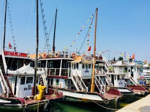 Schiff um Schiff reihte sich hier aneinander, für unzählige Tagestouristen, die eine Tour in die Bucht unternehmen wollten. Und fast ein kleiner Kreuzfahrthafen wartete auf uns, die wir uns in den Übernachtungsgästen anschlossen. Souvenirshops mit allerlei unnützem Zeug und eifrige Händler durften hier ebenfalls nicht fehlen.