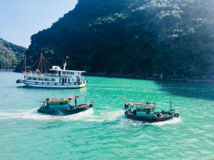 Den Aufstieg auf den Aussichtspunkt über die Bucht auf Titop Island sparten wir uns und warteten stattdessen am völlig überfüllten, aufgeschütteten Strand auf unser Abfahrt zum Boot zurück. Wir ließen das Getümmel um uns herum einfach geschehen, lachten über die Asiaten, die sich für das beste Selfie in Pose setzten und fragten uns ein paar Mal, ob wir eigentlich mit einem solchen Auflauf an Touristen gerechnet hatten oder nicht. Natürlich waren auch wir Teil des Business hier und schipperten herum und ja, warum sollten die Vietnamesen hiermit kein Geld verdienen – aber die Massen an Schiffen, Menschen, Diesel in der Luft und Plastikmüll im Wasser vor dieser Traumkulisse überraschte uns dann doch.