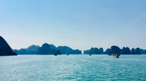 Unsere Unterkunft an Bord der „Lavender Cruise“ war eigentlich ganz okay, das Wetter spielte mit und der Wellengang bislang ebenfalls. Gemeinsam mit gefühlt (oder tatsächlich?) hunderten anderen Dampfern bahnte sich schließlich auch unser Boot den Weg zwischen den berühmten Felsinseln der Halong Bay hindurch. Fast 2.000 dieser vorgelagerten Inselchen sollte es hier geben. Das Panorama war toll und man musste die anderen Boote einfach versuchen so weit wie möglich auszublenden.