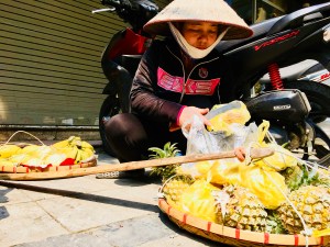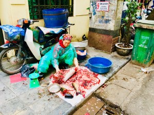 Dann aber gestärkt auf zur nächsten Citytour, dieses Mal wieder auf eigene Faust einfach los. Schon vor den Stufen unseres Hotels hätten wir rohes Fleisch, Obst und Gemüse von den Händlerinnen kaufen können, auch den Fischen wurden gerade noch auf dem Gehweg die Schuppen abgekratzt. In der einen Straße kleine Marktstände und fliegende (oder Fahrrad schiebende) Händlerinnen mit allerlei Zutaten, in der nächsten Straße Suppenküchen und Streetfood-Stände, in denen die Zutaten direkt zum Frühstück verarbeitet wurden.