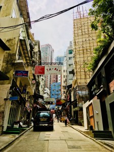 Nur ein paar Schritte weiter gelangten wir zum so genannten PMQ, ehemals Police Married Quarters – heute aber nicht mehr als Wohnunterkünfte genutzt. Hier hatten sich lokale Künstler und Designer angesiedelt, die im Kontrast zum allgegenwärtigen „Chinatown“-Feeling ganz hippe und moderne Geschäftsideen verfolgten und Designerstücke in kleinen Shops auf mehreren Etagen zum Verkauf anboten. Erinnerte ein wenig an Bikini Berlin 🙂