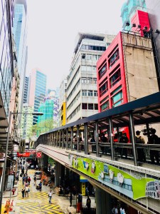 Mitten im Financial District trafen wir uns mit dem heutigen Guide Matthew Lau, der ebenfalls viel zur Wohnsituation, Esskultur und dem HKG-Lifestyle zu erzählen hatte. Unterwegs in Central kamen wir natürlich nicht an den berühmten Escalators vorbei, die über fast 800 Meter mit 20, aneinander gereihten Rolltreppen die längste Rolltreppe der Welt im teils steil ansteigenden Hong Kong bilden und die Hong Konger morgens ins Office unten in der City und am Nachmittag wieder nach oben zu den Appartements befördern. Wir fuhren heute jedoch nur einen kleinen Abschnitt, lugten in die ein oder andere Seitenstraße hinein und erspähten die hier so präsenten Wäscheleinen, Klimaanlagen oder Bambusgerüste an den Hochhäusern (selbst die Skyscraper werden noch unter Verwendung der traditionellen Bambusgerüste saniert).